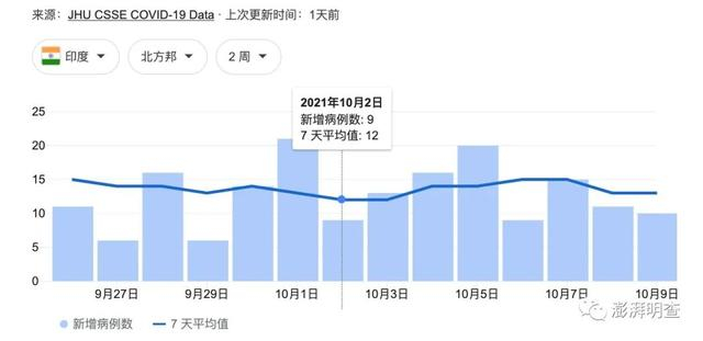 美国约翰斯·霍普金斯大学数据显示,北方邦在10月2日那一天新增新冠病例数为9,前一天(10月1日)这一数字为21,一周平均日增确诊病例数为12。