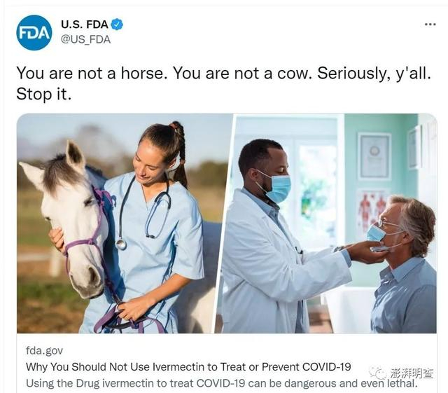 美国食品药品监督管理局(FDA)在其社交媒体推特账号上发文称,“你不是马,也不是牛”,以此劝说民众不要用伊维菌素治疗新冠。