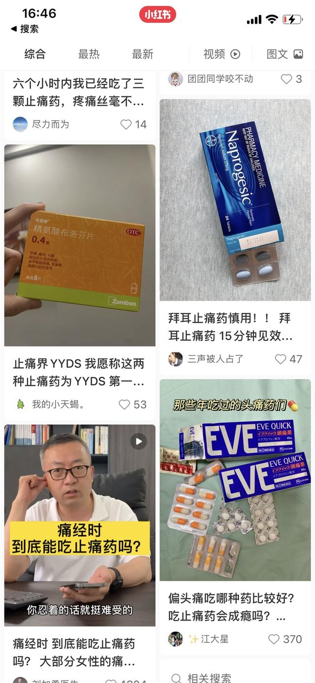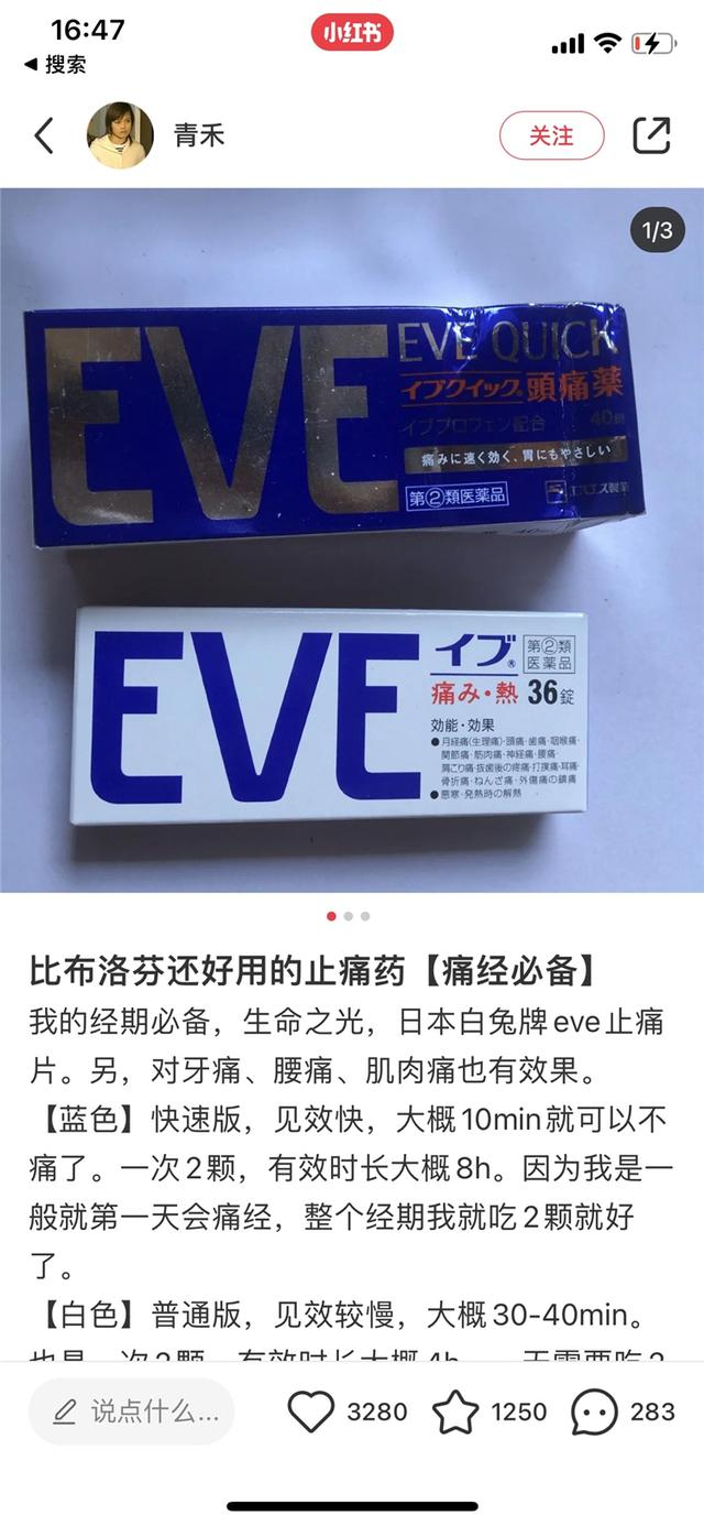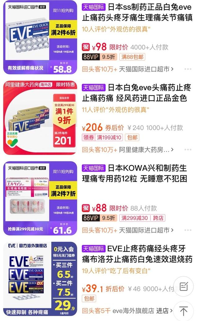 除了药房,网络购药也成了许多人获得止痛药的途径,上游新闻记者在购物网站查询发现,最热门的止痛药之一是一个名为“EVE白兔止痛片”的日本产止痛药,网站显示,该止痛药已经拥有“10万+回头客”。然而,这个品牌的止痛药成分中含有烯丙基异丙基乙酰脲,会导致血小板减少性紫癜,是多个国家的禁用药物,我国也并未批准其药用,但在日本可以使用。该药的主要止痛成分,实际上仍旧是布洛芬,和国内售卖的布洛芬效果差别并不大。