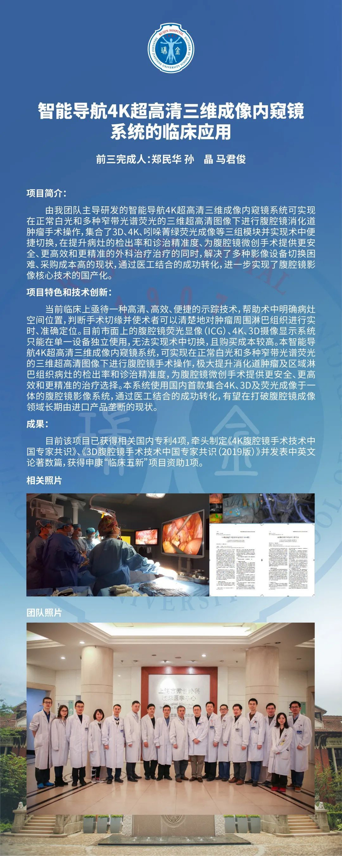 目前该项目已获得相关国内专利4项,牵头制定《4k腹腔镜手术技术中国专家共识》、《3d腹腔镜手术技术中国专家共识(2019版)》并发表中英文论著数篇,获得申康“临床五新”项目资助1项。