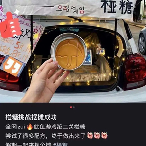 “当时也是在看《鱿鱼游戏》这个剧,还在小红书刷到韩国老爷爷在摊位现做这个糖饼,感觉很有意思就也想试试。”小童说,自己一直有创业的心,但又不太敢,这次看到剧的热度很高,就火速买了工具,逼了自己一把,“从有摆摊想法到开始摆摊就花了2天时间。”不过,研制椪糖的过程还是失败了好几次,要么颜色太深,要么小苏打放多了太膨胀了,还遇到过粘在板上就拿不起来的情况。