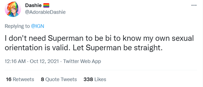 比如下图这位自称女双性恋、且点赞转评过许多支持性少数议题的美国网民,就认为自己的性取向是自己的事,并不需要DC漫画靠修改人设来替自己发声,她在文末建议:还是让超人当异性恋吧。