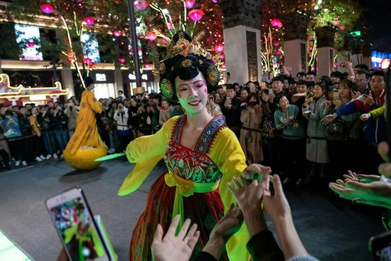 ▲大唐不夜城的“不倒翁”小姐姐与游客互动。图源互联网