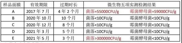 测试结果显示——有两款产品菌落总数超标。一款过期了4年2个月,菌落总数为5.5万cfu/g(表示1克检样中含有细菌菌落5.5万个),霉菌总数为5.9万cfu/g(表示1克检样中含有霉菌5.9万个)。一款过期了3个月菌落总数大于30万cfu/g(表示1克检样中含有细菌菌落30万个)。