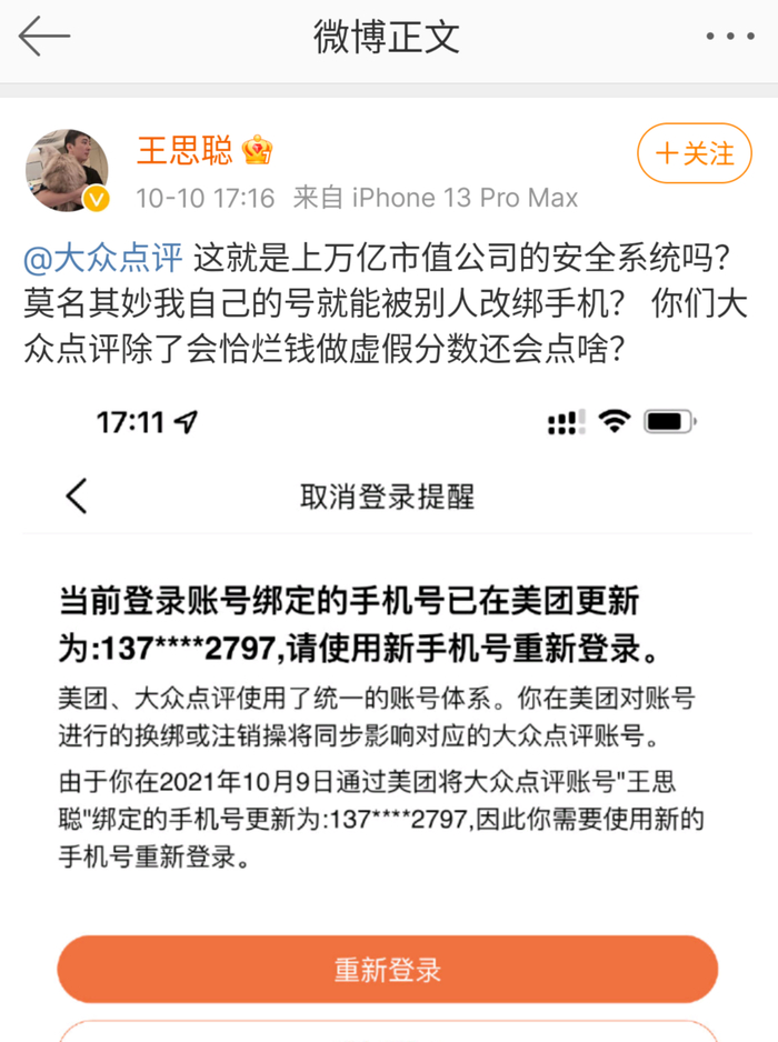 10月10日,王思聪在微博称,自己的大众点评号“莫名其妙”被别人改绑手机,并@大众点评“这就是上万亿市值公司的安全系统吗?”之后又再次转发微博称,“国家数据安全法实施后市值万亿的美团点评依旧我行我素。”