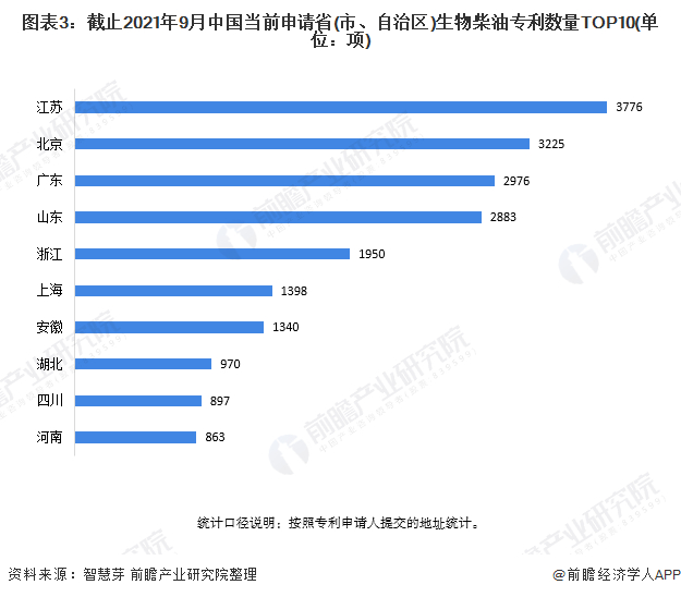 中国方面,江苏为中国当前申请生物柴油专利数量最多的省份,累计当前生物柴油专利申请数量高达3776项。北京、广东、山东当前申请生物柴油专利数量均超过2000项。中国当前申请省(市、自治区)生物柴油专利数量排名前十的省份还有浙江、上海、安徽、湖北、四川和河南。