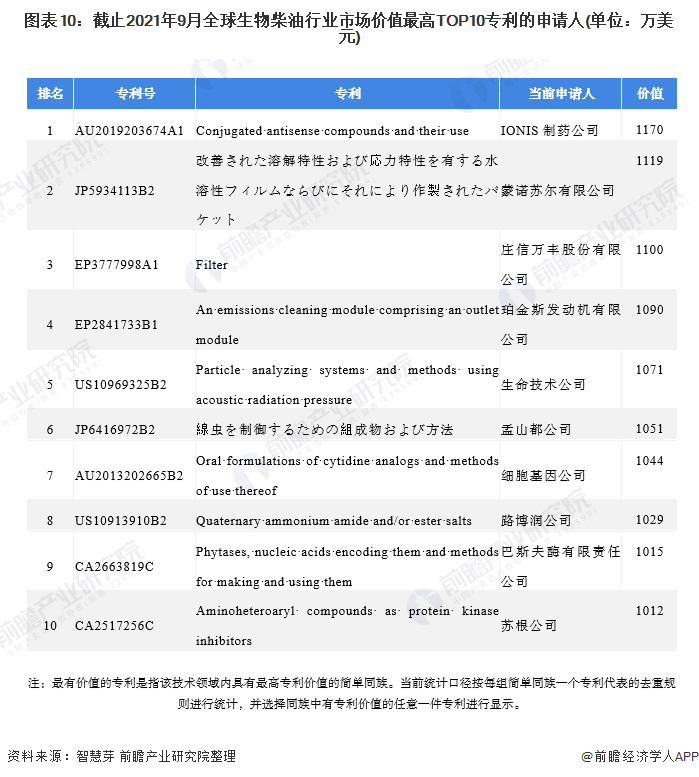 全球生物柴油市场价值最高TOP10专利中,申请人集中度极低。其中,价值排名首位的专利由IONIS制药公司公司申请,该专利价值达1170万美元。