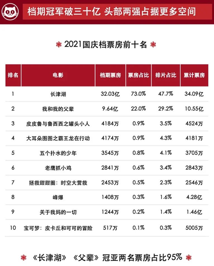 10月11日,大陆院线总票房报收1.25亿。《长津湖》单日票房1.03亿,累计票房达42.53亿,超过《复仇者联盟4:终局之战》晋升大陆影史票房榜第六名。