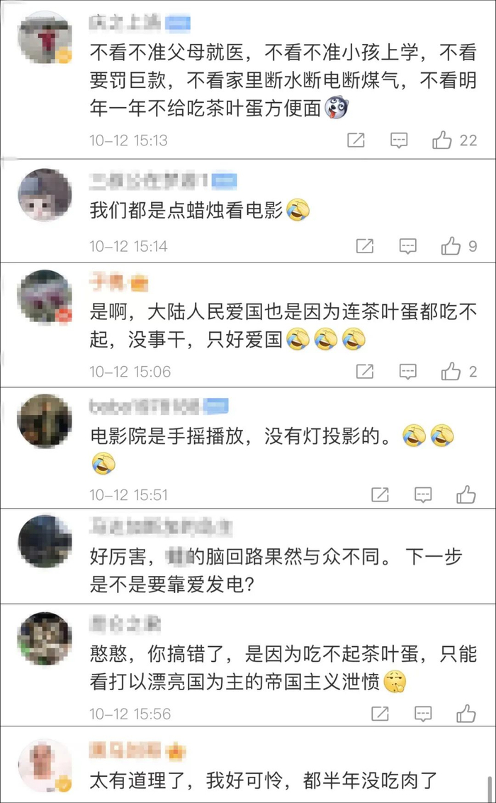 没有爱情片只能看抗美援朝片?没电还能看电影?这番神逻辑快把大陆网友笑傻:是啦是啦,我们都是举着蜡烛在看电影,不看规定的电影会领不到茶叶蛋和方便面啦!