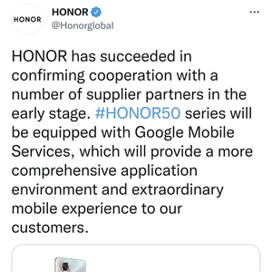 今年初,华为与荣耀正式官宣分家,荣耀便一直在致力于重构曾经破损的全球供应链。在与微软官宣合作仅一个月后,10月11日,荣耀官方在推特上宣布,公司已经成功与多家供应商确认了后续的合作,荣耀50系列将配备谷歌GMS服务,为客户提供更全面的应用环境和移动体验。