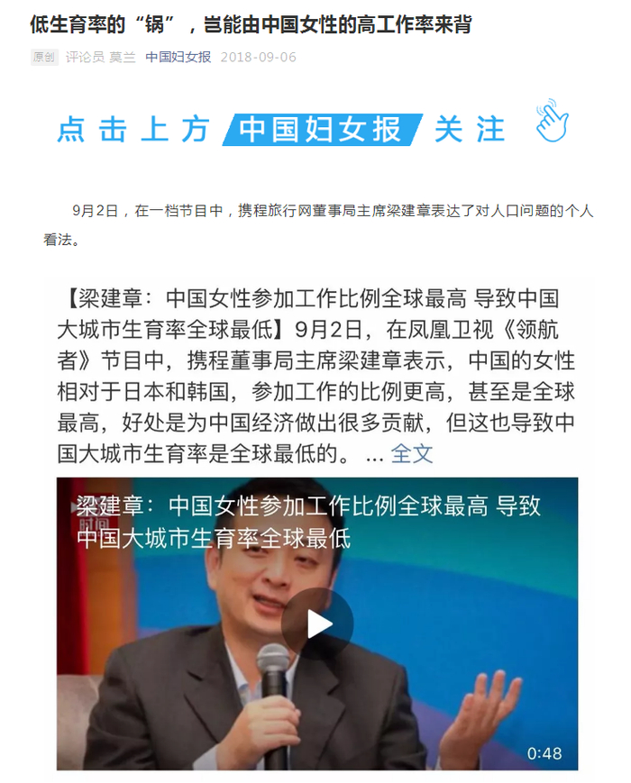 继“三孩”政策后,这是迈向“生育友好型”社会的又一步。不过,女性就业率与生育率的关系一直有争议。携程网创始人梁建章曾在一档节目中说,中国女性参加工作比例全球最高,导致了“中国大城市生育率为全球最低”。这一看法遭到《中国妇女报》的反对,认为是乱甩锅。