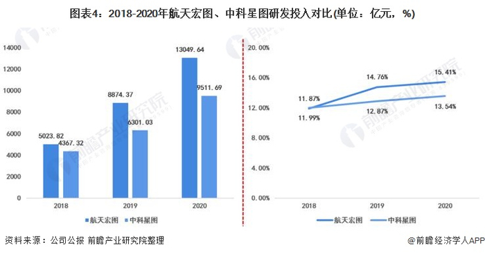 从航天宏图和中科星图两家公司研发投入和研发投入占营收的比例来看,2018-2020年,航天宏图研发投入金额始终高于中科星图,2020年航天宏图研发投入金额为1.30亿元,而中科星图为9511.69万元,相差37.19%。2018-2020年,航天宏图研发投入占营收比例除了2018年外,均高于中科星图,2020年航天宏图研发投入占营收比例为15.41%,中科星图为13.54%,航天宏图高出1.87个百分点。