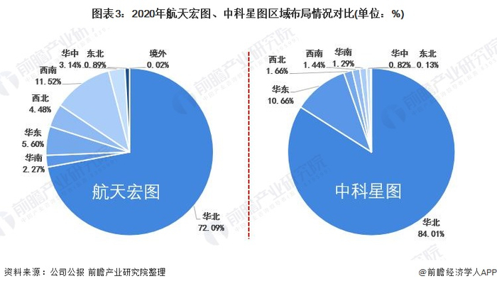 从航天宏图与中科星图区域布局情况来看,航天宏图区域布局重点在华北地区,2020年占比高达72.09%,销售金额为6.10亿元,其次为西南地区,占比11.52%,销售金额为0.98亿元,公司有少量境外业务,占比为0.02%;中科星图区域布局重点也在华北地区,2020年占比高达84.01%,销售金额为5.90亿元,其次为华东地区,占比10.66%,销售金额为0.75亿元,并未开展境外业务。从区域布局情况看来,两家公司业务主要集中在华北地区,占比都达到了70%以上,航天宏图向西南地区开拓市场,而中科星图向华东地区进发,各有千秋,但航天宏图已逐渐开展了海外业务,布局更加广泛。