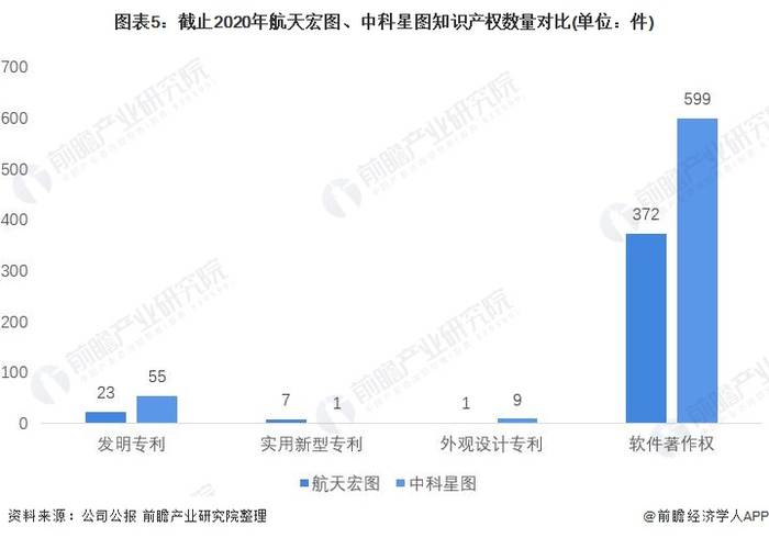 从航天宏图和中科星图知识产权情况来看,截止2020年,航天宏图累计获得发明专利23件,中科星图为55件;航天宏图累计获得实用新型专利7件,中科新图为1件;航天宏图累计获得外观设计专利1件,中科星图为9件;航天宏图累计获得软件著作权372件,中科星图为599件,在知识产权方面,中科星图更有优势。