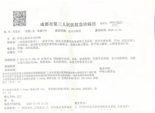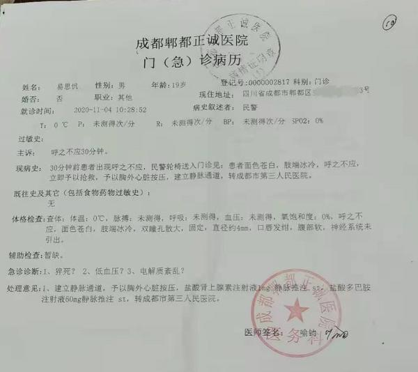 成都郫都正诚医院门诊病历显示,易思忛于2020年11月4日10:28就诊,就诊30分钟前出现呼之不应,门诊见患者面色苍白、肢端冰冷,予以胸外心脏按压、建立静脉通道后转成都市第三人民医院。
