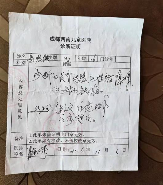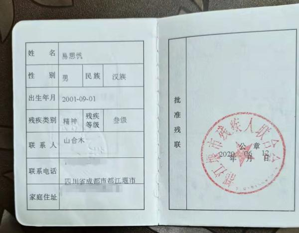 生活不易,易思忛一直是全家人最大的快乐,他虽然智力有障碍,但乖巧内向,“他胆子很小,有人做错了事情,说是他做的,他会很害怕,承认是自己做的。”山浩说,2019年,家人带着易思忛到成都安定医院检查,诊断证明,易思忛有强迫、抑郁、偏执等症状,诊断报告显示,易思忛经常莫名的担心、害怕,心理较脆弱,可能会自责倾向,还可能有孤独感。