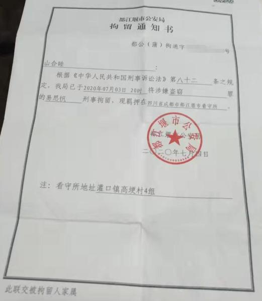 7月4日,都江堰市公安局出具的《拘留通知书》显示,易思忛涉嫌盗窃罪被刑事拘留。
