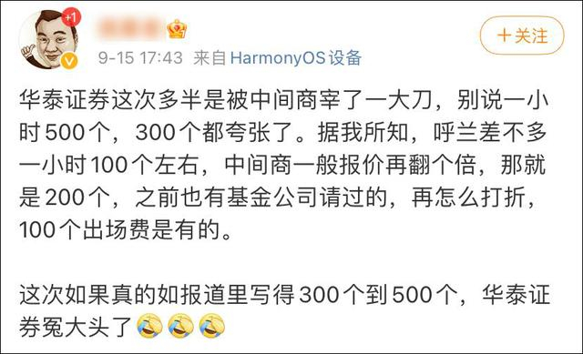 此事要从9月中旬的相关报道说起,当时有媒体爆料称,华泰证券花巨款请呼兰做直播推广,“呼兰作为脱口秀界的知名艺人,一小时的出场费用大约在300-500万之间”。