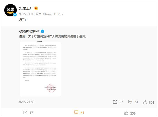 针对此事,呼兰所属公司上海笑果文化传媒有限公司于9月15日,通过其微博@笑果工厂 发布澄清声明称,关于呼兰商业合作费用的言论系无中生有、恶意捏造的谣言,均不符合事实,属于不实报道。