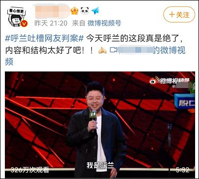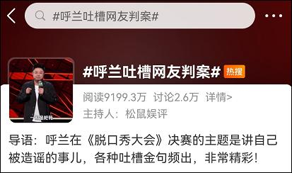 昨晚(10月12日),《脱口秀大会》第四季总决赛上半场播出,选手呼兰在节目中辟谣天价出场费,吐槽网友判案一事冲上微博热搜。