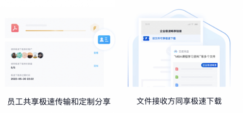 进入移动互联网时代,无纸化操作成为常态,企业内部、企业与客户、合作伙伴之间办公文件线上传输需求激增。与此同时,企业日常办公中时共用云账号,传输效率低、信息不安全等问题频发。从百度网盘公开的信息来看,百度网盘企业版是基于其近9年的云存储能力,打造的多人共享协作、文件极速传输解决方案。