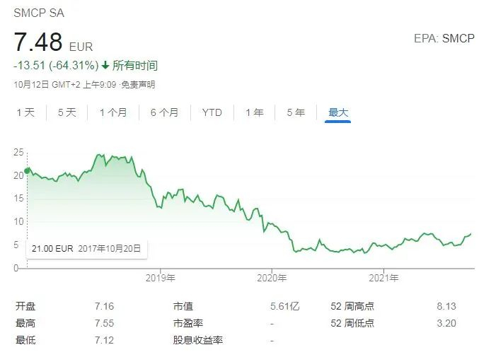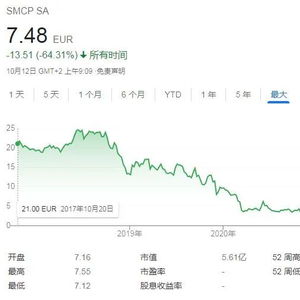 在山东如意的经营下,SMCP业绩逐年上升,营收从2016年的6.8亿欧元增长到2019年的11.31亿欧元,年复合增长率达18.5%。但与之相对,SMCP的股价却从上市之初的21欧元下降到2020年最低点3.3欧元,市值更是从最初的17亿欧元缩水到2020年5月的3亿欧元。