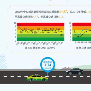 受2020年新冠肺炎疫情影响,居民出行量有所降低,中心城区高峰时段道路交通指数为5.07,相较于2019年的5.48降低了7.48%,处于“轻度拥堵”级别,意味着道路整体运行情况好于2019年。