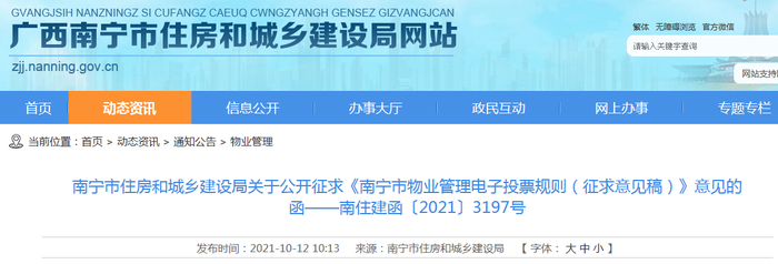 为贯彻落实《广西壮族自治区物业管理条例》,创新优化业主共同决定物业管理事项决策的电子化、网络化、信息化,增强业主在管理小区自治活动中的公平性、公开性和高效性,结合本市实际,我局牵头起草了《南宁市物业管理电子投票规则(征求意见稿)》。现向社会各界公开征求意见,有关单位和社会各界人士可以在2021年10月26日前,通过电子邮件将意见发送到邮箱:nnszfjwyk@163.com。提出意见建议的有关单位,请同时注明单位名称、通讯地址、电话等内容;个人署真实姓名、身份证号码、通讯地址、电话等内容。