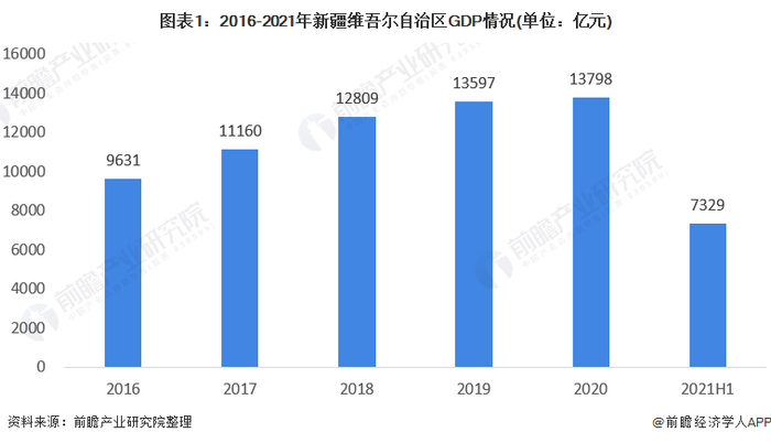 2016-2020年,新疆维吾尔自治区生产总值呈稳步上升态势。2020年,新疆维吾尔自治区实现生产总值1.38万亿元,按可比价格计算,比上年增长4.3%;其中,其全年在高技术制造业的增加值比上年增长25.0%。2021年上半年,新疆维吾尔自治区生产总值为7329亿元。这样稳固的GDP增长给涉及高技术制造的LED产业奠定发展基础。