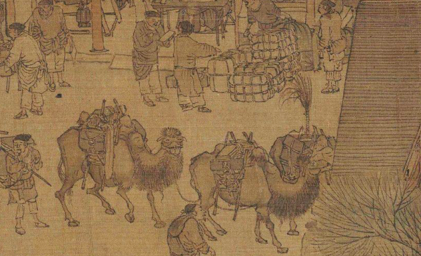 北宋时期,史籍中留下了众多西域进贡骆驼的记载。《宋史·本纪第一》中所载,“建隆二年(961年)春……灵武节度使冯继业献马五百、橐驼百、野马十”;《宋史·列传二百四十九》载,“(太平兴国)五年(980年),甘、沙州回鹘可汗……遣使裴溢的等四人,以橐驼、名马、珊瑚、琥珀来献……咸平四年(1001年),可汗王禄胜遣使曹万通以玉勒名马、独峰无峰橐驼、宾铁剑甲、琉璃器来贡”,《宋会要辑稿·蕃夷四》载:“(大中祥符)五年(1012年)五月八日,夜落纥、宝物公主遣使以宝货、橐驼、马来贡”,《宋史·列传二百四十九》载:“(于阗国)天圣三年(1025年)十二月,遣使罗面于多、副使金三、监使安多、都监赵多来朝,贡……独峰橐驼”。除此之外,骆驼商队也是繁华的汴京城中一道亮丽的风景线(图13)。