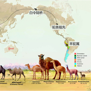 图1:骆驼进化和迁徙路径图(引自P.A.布格尔等《现代世界中的旧世界骆驼》)