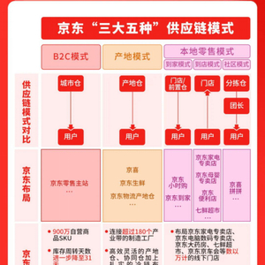 小时购的发布,标志着京东多种供应链布局的全面成熟。在以京东零售主站为代表的B2C模式,以京东生鲜、京喜、京东物流产地仓为代表的产地模式,以及到家、到店、社区3种细分供应链模式组成的本地零售模式,组成了领先行业的“三大五种”供应链模式,其中京东运动户外事业部的“京东运动联盟”、京东宠物业务部的“京东宠物前置仓业务”和京东图书的“京东书店”线上连锁书店是到家模式中较为突出的成功案例,让消费者享受到更为便捷的本地即时到家服务。