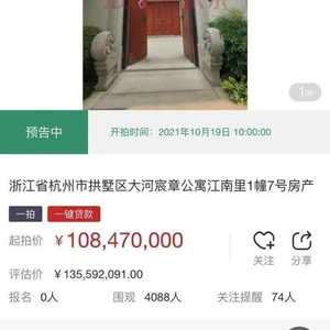 10月19日,京东网司法拍卖平台上,一套位于杭州拱墅区大河宸章公寓江南里1幢7号的中式合院将进行公开拍卖,评估价约为1.356亿元,起拍价为1.0847亿元,相当于评估价的8折,起拍价折合每平方米为15.3027万元,参拍保证金为2160万元。