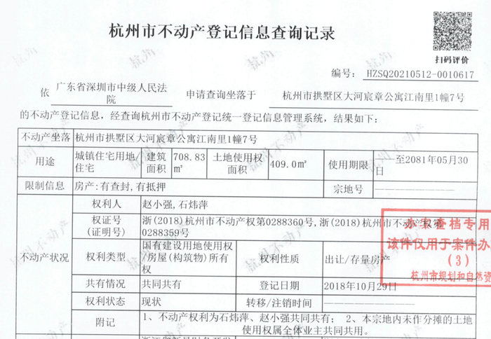 在拍卖网站上,还有份附件,其中一份杭州市不动产信息登记查询实录显示,这间豪宅的登记权利人为赵小强、石炜萍共同共有,登记时间为2018年10月29日。