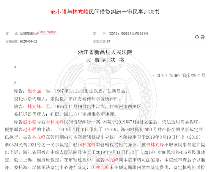 据新昌县人民法院2020年2月17日下发的关于林亢峰、赵小强的一审判决书显示,赵小强将一位名叫林亢峰的人告上法庭,要求其归还经营借款8000万元。