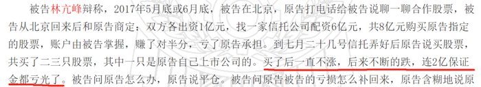 但林亢峰却说了一个完全不同的故事,林亢峰认为2017年5月底或6月底,赵小强和林亢峰双方商定,各出资1亿元,以2亿元保证金配资6亿元,再由林亢峰以8亿元的股票账户买入赵小强指定的股票,其中一只就是赵小强作为实际控制人和董事长的上市公司的股票。双方约定盈利平分,亏损由赵小强承担。