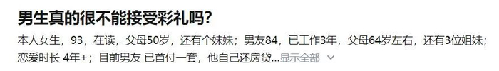 一位93年女生在知乎上提问“男生真的很不能接受彩礼吗?”,近1.2万知乎网友回答了该问题。
