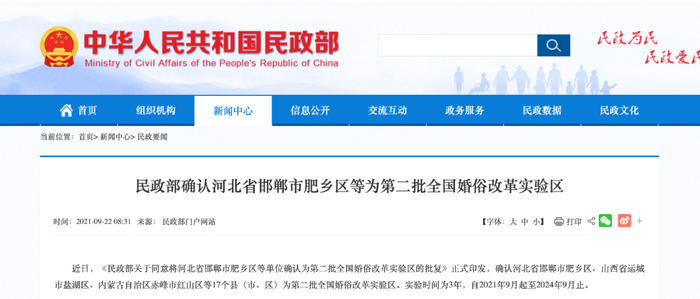 今年,民政部在全国共计设立了32个婚俗改革试验区,要求各单位根据2020年5月份印发的《关于开展婚俗改革试点工作的指导意见》,大力推进婚姻领域移风易俗,遏制婚俗不正之风。