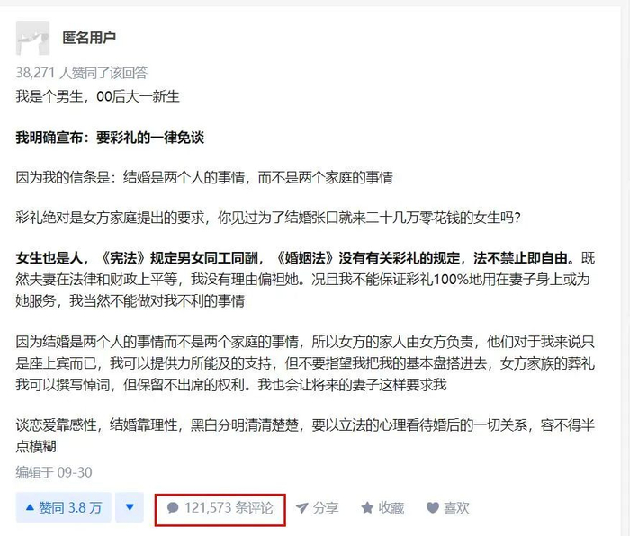 近日,知乎网友关于彩礼话题“吵翻”了。并创下了知乎平台的一个新纪录——有史以来最高的评论数记录。