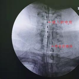 如图所示,通过将一根纤细的电极植入人体脊髓的背侧硬膜外腔,然后利用脉冲电流刺激脊髓神经以缓解疼痛。