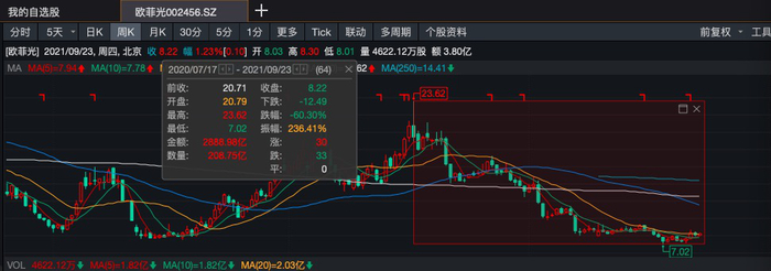 股价方面,在去年7月欧菲光参股公司被美国列入实体清单后,公司股价就接连下挫。截至今年10月13日,公司股价收于8.11元/股,较2020年的最高点23.62元/股累计下跌超60%,总市值264亿元。