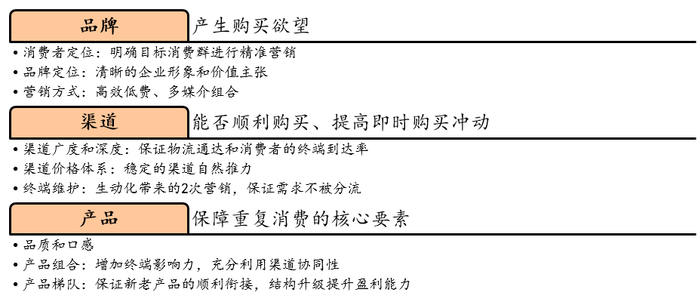 在这里,我们重点讲外部要素,也就是品牌、渠道和产品方面的内容。品牌让消费者产生购买欲望;渠道决定了消费者能否顺利购买,还可以提高即时购买冲动;产品是保证消费者重复消费的核心要素。