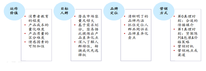 通过品牌塑造出人为的差异化,占据消费者心智,可以获得优先选择权和品牌溢价。如果把品牌营销的核心要素拆分来看,主要包括了运作价值、目标人群、品牌定位、营销方式4个部分。