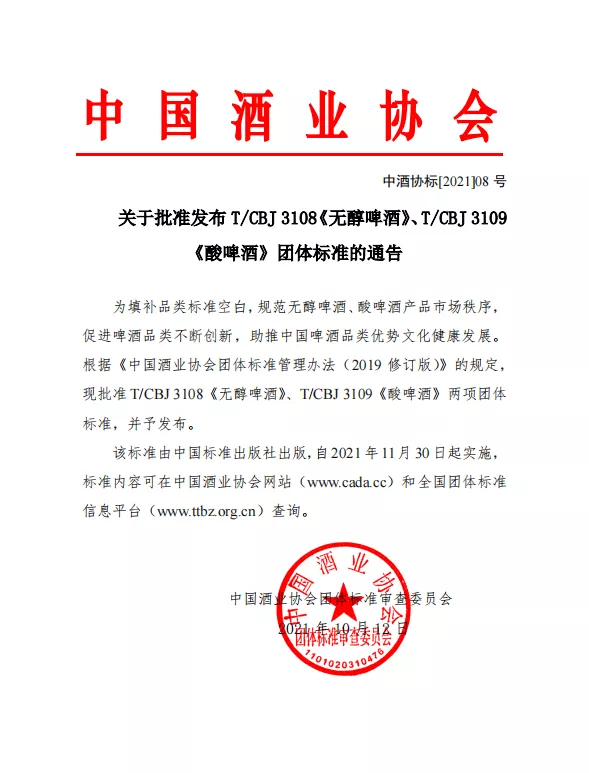 新京报讯(记者 郑明珠)中国酒业协会团体标准审查委员会日前发布通告称,根据《中国酒业协会团体标准管理办法(2019修订版)》的规定,批准T/CBJ 3108《无醇啤酒》、T/CBJ 3109《酸啤酒》两项团体标准,自2021年11月30日起实施。
