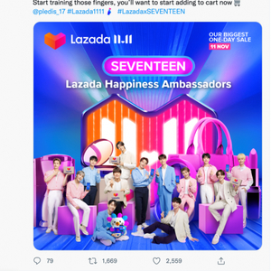 对此,SEVENTEEN也表示,“拍摄Lazada‘双11’MV是一次有趣且令人难忘的经历,我们很高兴能作为即将到来的 Lazada 11.11 超级秀的一部分参与演出。 作为东南亚领先的电子商务平台Lazada的区域幸福大使,我们期待与大家一起创造更有意义的体验,也请大家一如既往的继续支持Lazada和SEVENTEEN!”