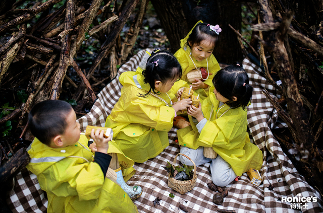 同时,登山老师还带领小朋友们探索自然的美好,在山野密林中增长见识,认识松塔、橡果等植物,逐步了解到日常食用的各类坚果,究竟是如何生长出来的。这种亲身实践探索的方法,不仅加深了孩子们对坚果的认知,也践行了荷乐士“食欲+食育+食愈”的品牌核心。