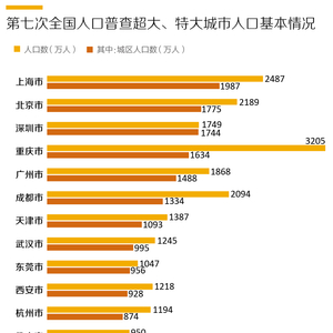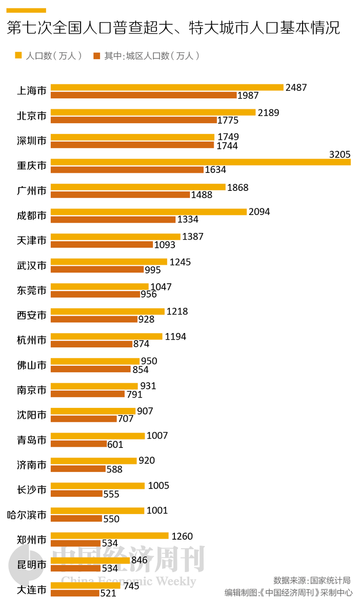 从总人口来看,重庆以3205万人的规模,超过上海(2487万人)和北京(2189万人),在国内城市中位列第一。借助重庆总人口占据第一的优势,重庆城区常住人口也达到1634万人,位居全国第四。