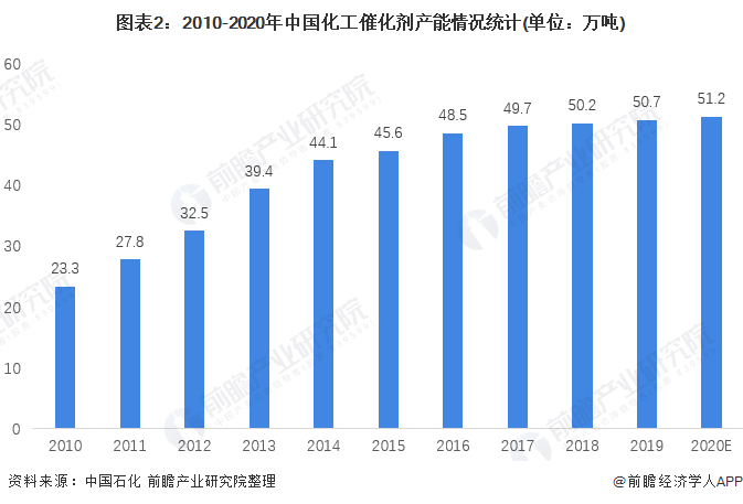 2010年,我国化工催化剂行业产能为21.6万吨,产能利用率为65%。随着落后产能的淘汰,我国化工催化剂行业产能利用率逐渐提高,2019年我国化工催化剂产能约为50.7万吨。催化剂作为重化工行业,随着2020年供给侧改革的进一步深化,前瞻初步估算2020年产能增长率和2019年保持不变,产能达到51万吨。