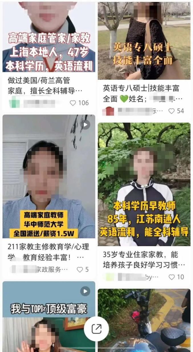 仔细一看,“985毕业、”“硕士”、“英语八级”、“海归”、“教师资格证”……一个个漂亮的标签暗示着,这些工作实质上就是家教、住家教师。