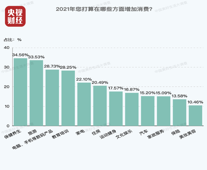 中国老年人,会把钱花在哪呢?《中国美好生活大调查》发现,老年人2021年消费意愿榜前三位分别是:保健养生、旅游和电脑手机等数码产品。经历2020年的疫情冲击后,老年人对健康的关注再度回升。他们增加保健养生的比例相比2019年提高了6%。除此之外,老年人更想多出去走走,看看世界的变化。从历史数据看,老年人旅游的意愿较去年提升了超4%。而关于旅游的想法,中国大妈比中国大爷意愿更高。(央视财经微信公众号)